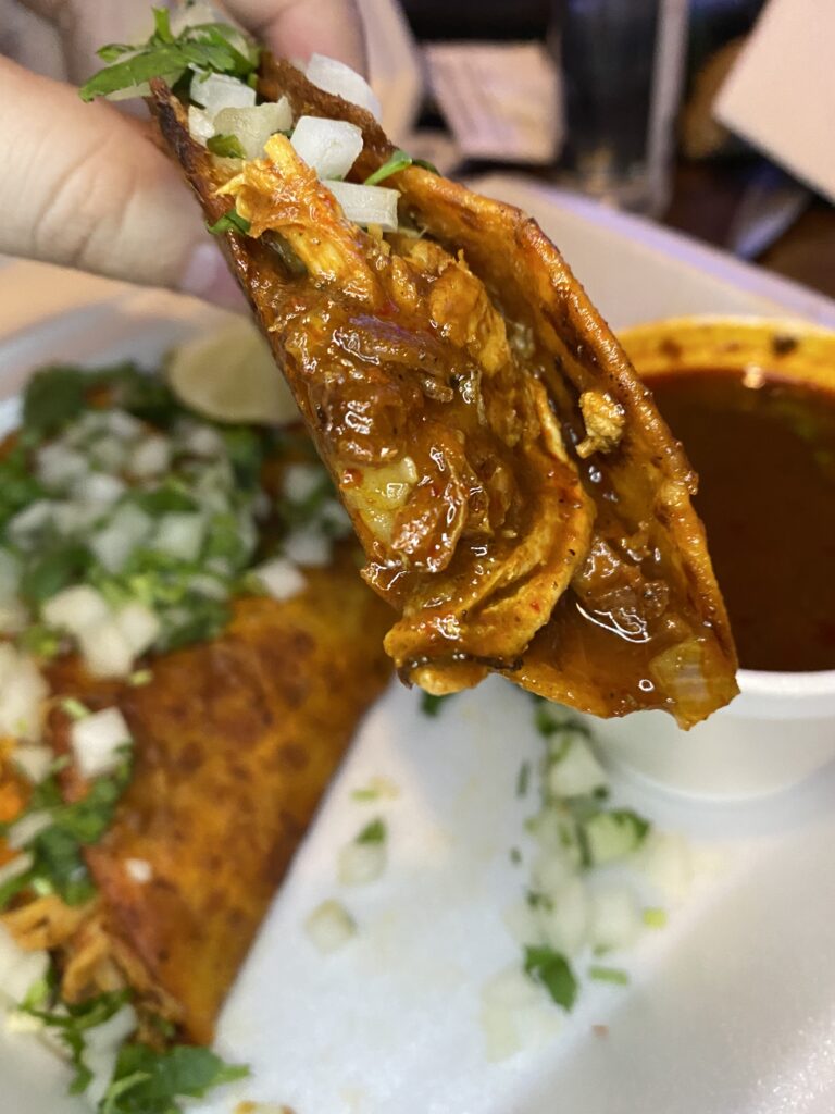 This isn’t just “soup.” It is a flavor bomb. It is thick, fatty, and packed with spices like clove and cinnamon that give it a warm, savory depth. You take that crispy taco, dunk it until it soaks up the broth, and take a bite. The contrast between the crunchy shell and the juice-soaked beef is unreal.