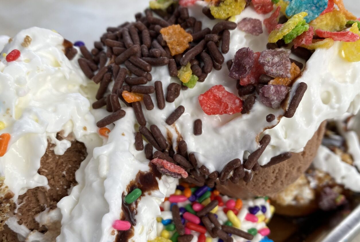 I asked the owner what to try, and before I knew it, I had a metal tray in front of me called the “Dirty 1/2 Dozen.” It had warm mini donuts as the base, topped with scoops of ice cream, fruity pebbles, rainbow sprinkles, chocolate drizzle, and whipped cream.