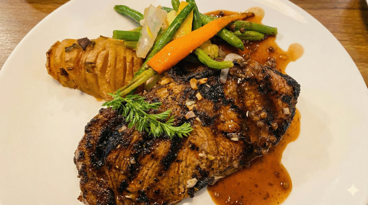 The Rib Eye The Grilled Rib Eye Steak is a massive cut, cooked to a precise medium-rare. The sear provides a necessary textural contrast to the tender interior. It is finished with a peppercorn demi-glace that adds a rich, savory depth, served alongside bouillon potatoes that absorb the sauce perfectly.