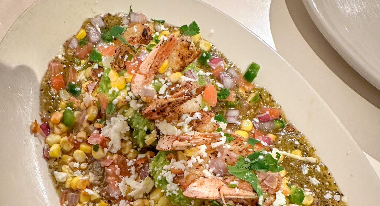 The Camarones A La Parrilla showcases grilled, chili-crusted shrimp served atop corn masa cakes. This dish is a symphony of flavors, with the smoky-spicy shrimp complemented by fresh guacamole, pico de gallo, and a rich charred tomatillo salsa.
