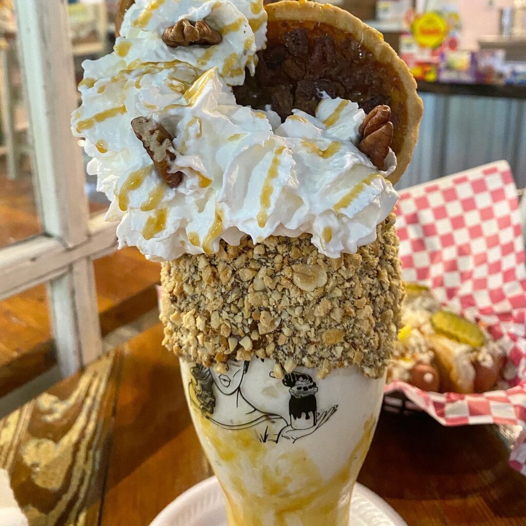 Then comes the real showstopper: a mountain of whipped cream, more pecans, a literal mini pecan pie, a pecan roll, and even more pecans for good measure. It is a dessert, a milkshake, and a sugar-fueled sculpture all in one.